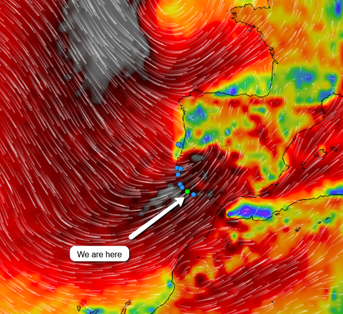 Tror aldrig vi sett en väderkarta där landsgränserna inte syns för allt oväder. Men Nomada befinner sig på Algarvekusten, i Portimao vid den gröna pricken – och vi har sökt skydd inne i marinan…