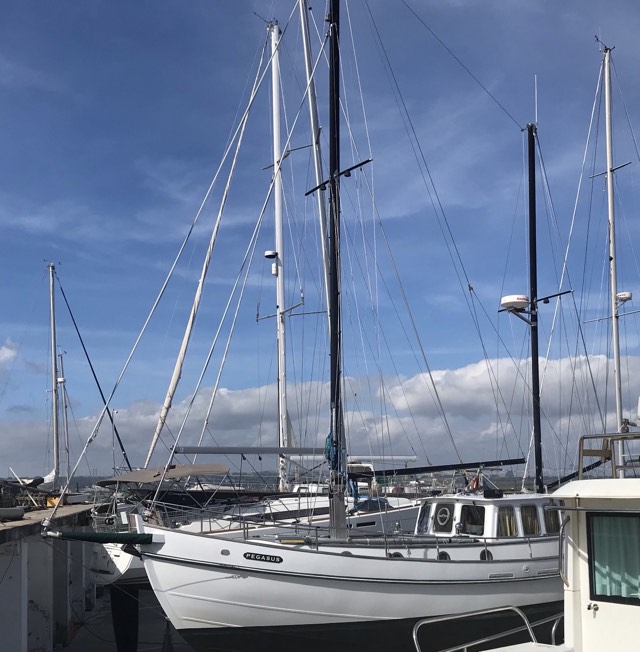 Vilket i sin tur för in mig på temat segelbåtar. Nu har jag inte för avsikt att köpa båt, men jag kan inte låta bli att drömma. Och intill Konstruktörens Nómada står en segelbåt som har allt det jag önskar. Byggd i järn, twin-kölad, fällbar mast, ketch-riggad, bogpropeller, rullfock på båda förseglen, ett rejält skarndäck och likaså en styrhytt värt namnet. Ingen segelbåt man kappseglar med. Men ett flytande hem att gå i kanaler med, som man med fördel använder där tidvatten råder men som ändå tål att seglas på havet med. En segelbåt jag skulle kunna hantera själv. Som sagt, drömma går ju. Och det säger jag samtidigt som jag lever ett drömliv.