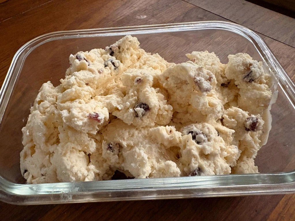 Jag hade nämligen för mig att jag sett en skvätt portugisisk brandy (Macieira) någonstans i Konstruktörens skafferi. Och russin och ägg likaså visste jag fanns, frågan var bara hur det var med vispgrädde? Men efter lite letande så fann jag allt jag behövde för att kunna tillverka en smarrig handvispad gräddglass med smak av romrussin (fast nu med en twist eftersom jag marinerade russinen i brandy istället). Vispa, vispa, vispa och vips så kunde jag ställa glasskrämen i frysen, dit jag med jämna mellanrum återkom för att röra om.