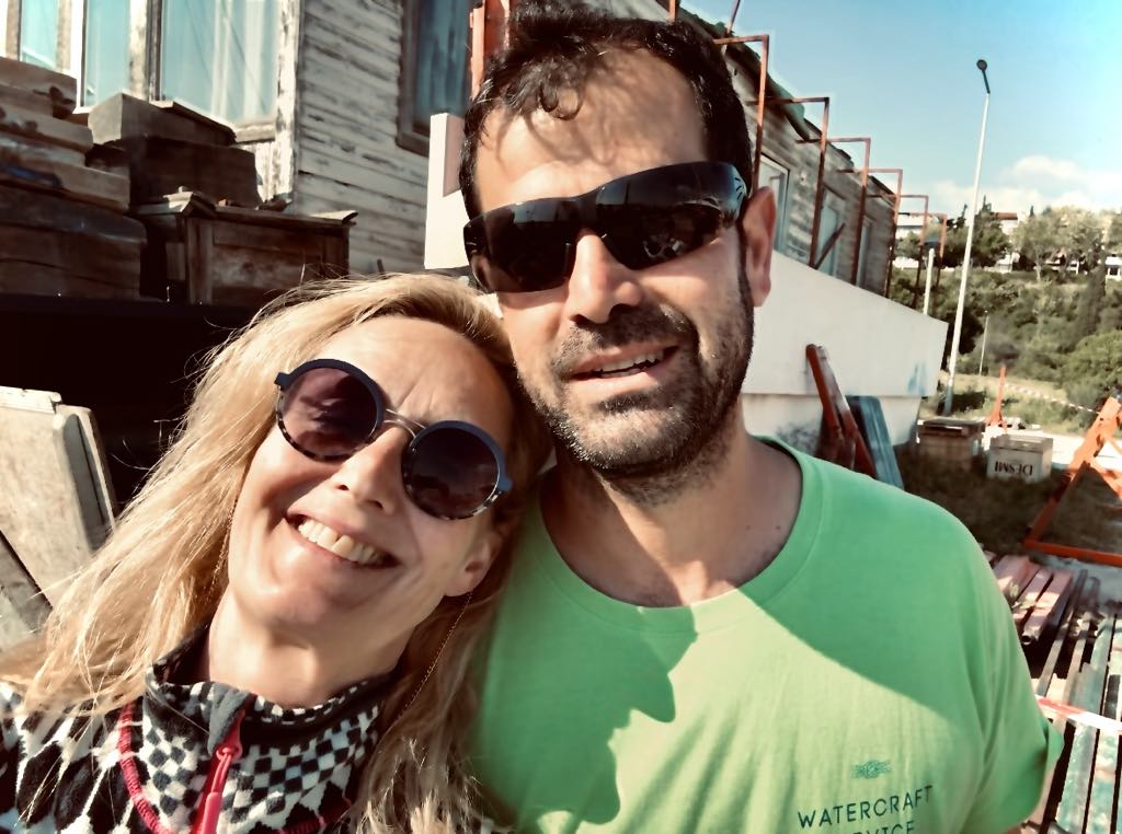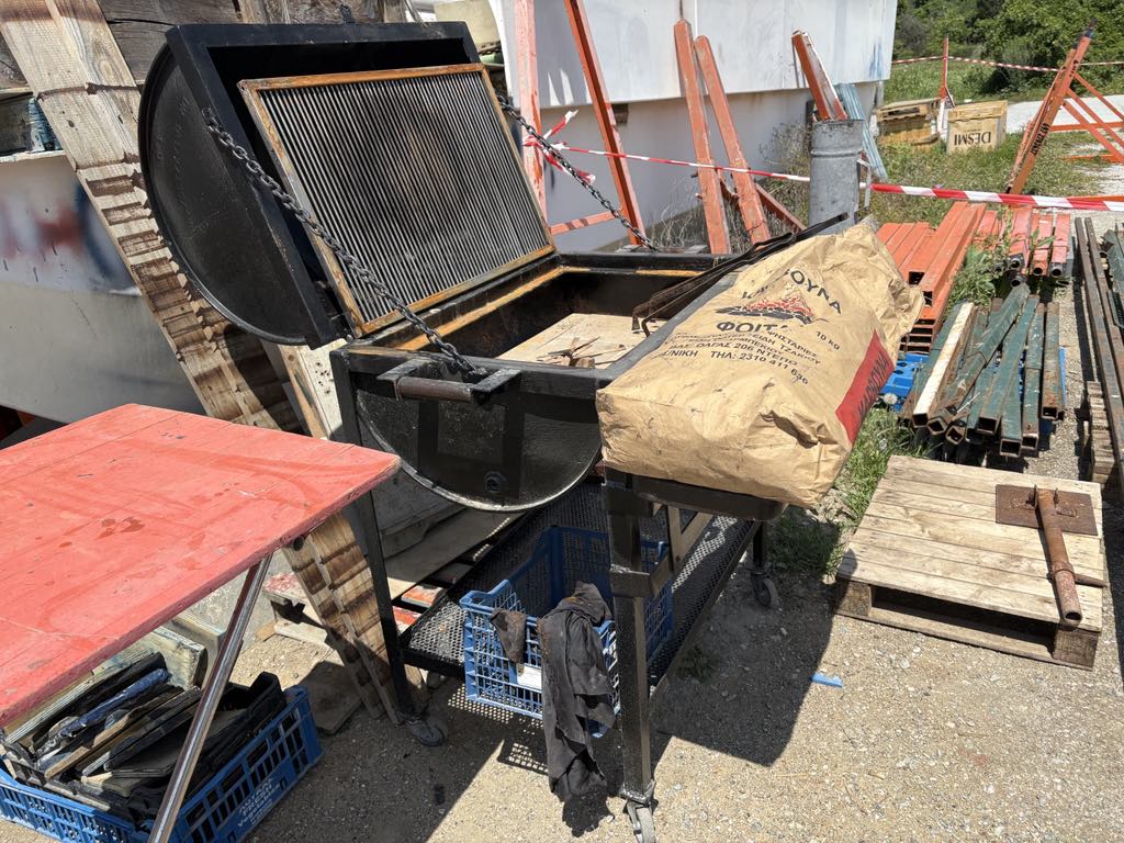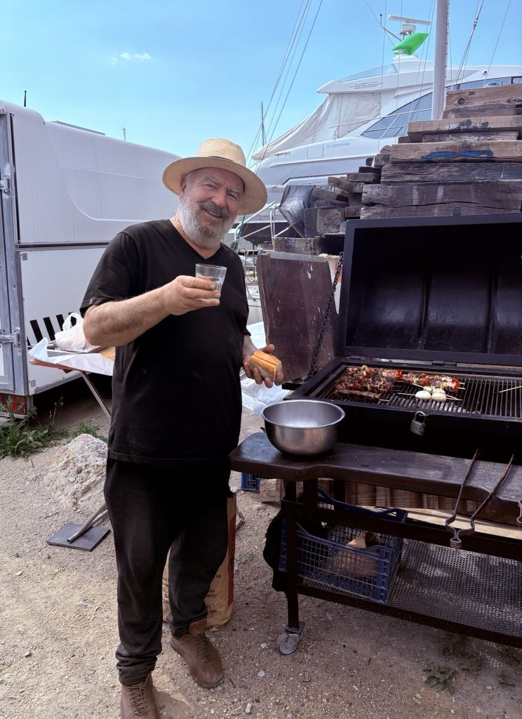 Vi äter, skrattar och skålar för livet, och det känns så gott att se alla. Maten smakar förträffligt, med den där smaken bara en grill kan ge, och tomaterna är så söta att jag inte kan sluta plocka ur skålen. Vi delar minnen, fina minnen från tiden med Wilma i Kalamaria. Vid ett tillfälle kommer Alex fram och berättar hur mycket han uppskattat att ha oss där, särskilt under pandemin. Utanför marinan var allt tungt och deprimerande; folk led under hårda restriktioner. Men vi, som fick vara inne på marinaområdet, kunde – trots att vi var inlåsta – röra oss fritt där. Med mitt och Tjoppes glada humör blev dagarna roliga, menade Alex. Vi jobbade med båtarna, men inte mer än att vi inte hann med andra projekt, som grillprojektet som vi döpte till 55+. En dag hade Alex frågat Tjoppe om han kunde svetsa en ny grill, eftersom den gamla inte längre höll för gubbarna – ranglig efter år av användning och grekisk ouzo innanför västen. Under en veckas tid jobbade Tjoppe med grillen med Alex som assistent, och resultatet blev enastående. Att vi enligt pandemireglerna inte fick grilla hindrade oss inte – vi gjorde det ändå, i smyg.