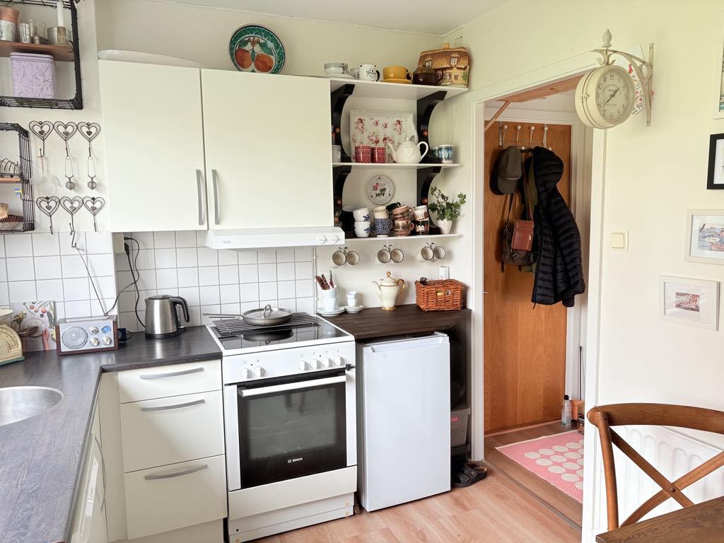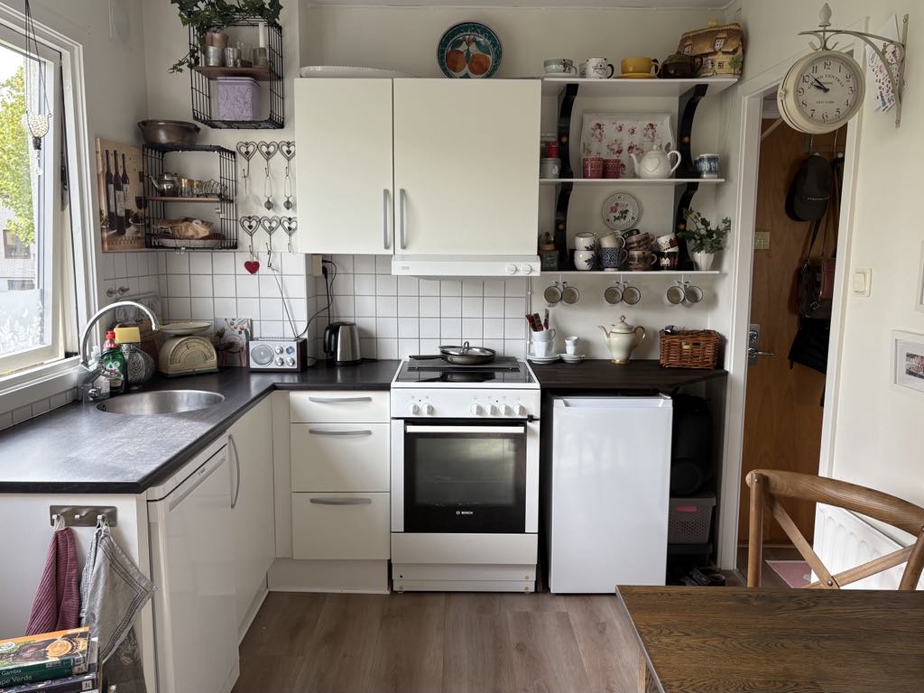 Så vad har jag gjort för att trivas på min begränsade yta? Förutom att nyttja ytorna utan att för den sakens skull övermöblera lyan så har jag omgett mig med ”hobbies och minnen”. Här kan jag rita, måla, skriva, spela gitarr eller sjunka ner i min läshörna, i min renoverade 1800-talsstol som gått i Tjoppes släkt (om jag inte väljer att promenera bort till biblioteket vill säga). Jag har träningsredskap hemma, gummiband och hantlar som inte tar någon plats och i källaren finns verktyg om jag får lust att snickra något. Skateboardåkning kan jag sätta igång med direkt från ytterdörren och jag har en ryggsäck redo för vandring i skog och mark eftersom jag bor nära ett naturreservat. Cykeln används flitigt och mina promenadkängor likaså, dessa tar mig runt i hela Halmstad. Gatan där jag bor är kantad av låg 40-talsbebyggelse med lummiga trädgårdar och på baksidan av mitt hus finns en villaträdgård med härlig gräsmatta. Jag har nära till Västra stranden och havet. Och så är jag en riktig fika-fanatiker… jag älskar att dricka te ur härliga muggar och välja mellan olika tesorter (men jag är inte lika nördig som min vän Malin i Lysekil).