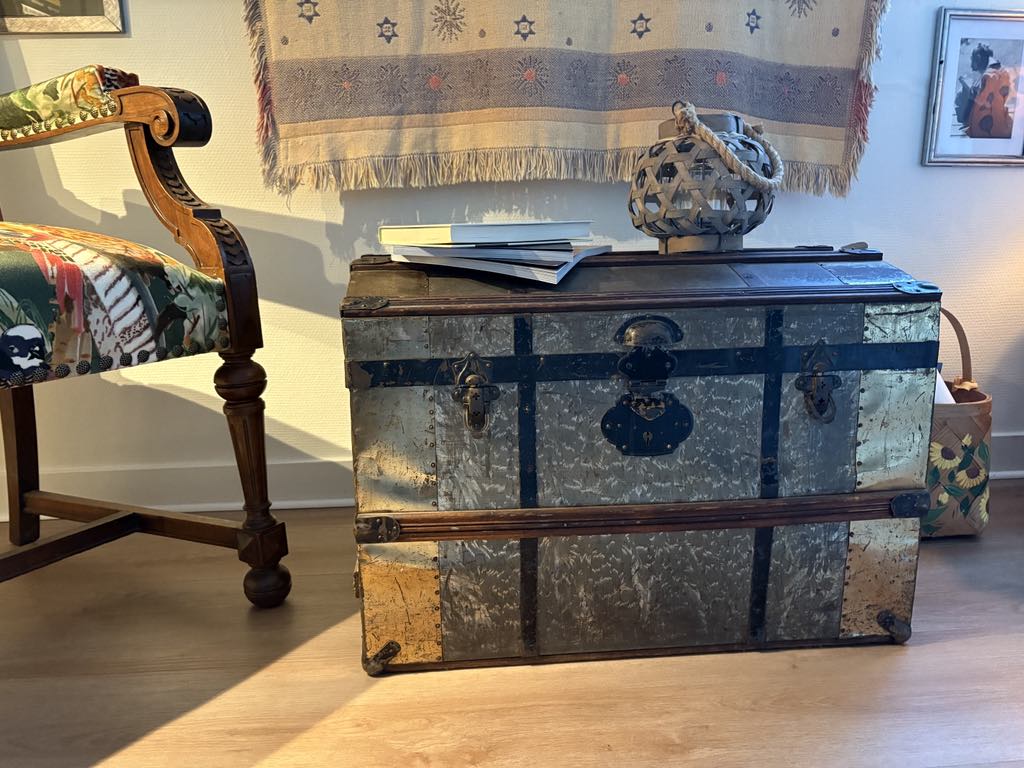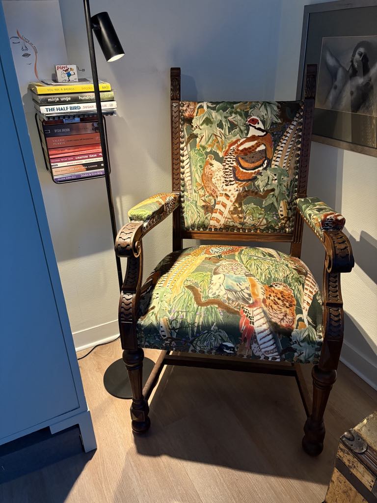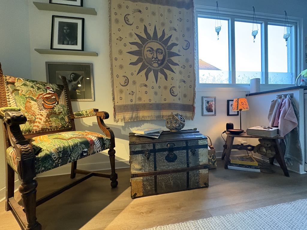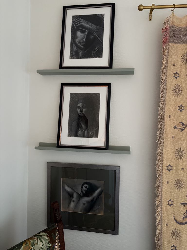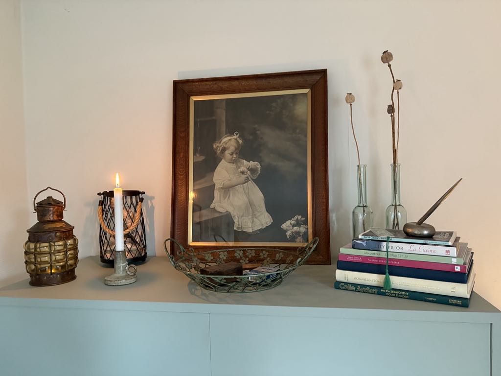 Här ryms minnen och hobbies… Jag har tagit tillvara på möbler som vid övertagandet var rätt slitna men som jag låtit renovera. Som stolen från 1800-talet och det blå skåpet som jag målat om i en grönare nyans (skåpet är efter svärfar och fanns i Tjoppes barndomshem). Kistan har tillhört min mormor och konsten har jag målat själv (de svartvita pastellmålningarna). Flickan på tavlan föreställer Tjoppes farmor som barn, fotot är taget på Copacabana i Rio de Janeiro i Brasilien där hon växte upp…