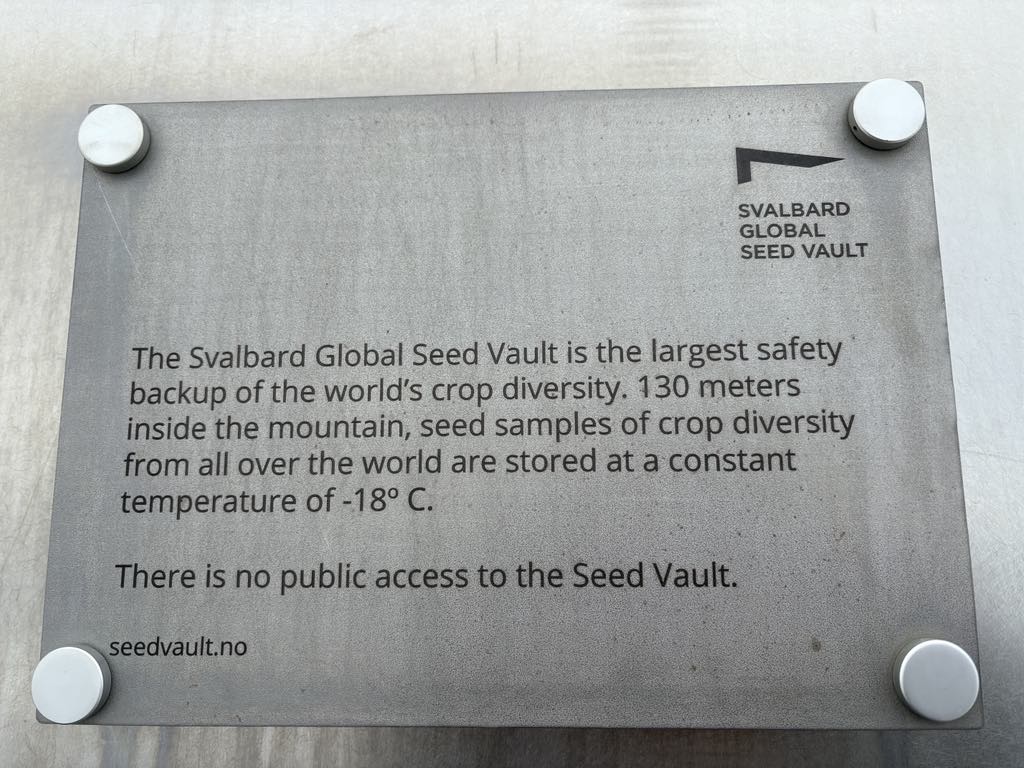 Det började med att vi besökte Svalbards Globala Fröbank som ligger gömd i permafrosten. Här vilar miljontals frön från världens hörn som en tyst väktare mot klimatkriser och katastrofer; förloras någon gröda från jorden så ska den kunna återupptas genom fröbankens försorg (vilket också har hänt). Nu får man inte kliva in i byggnaden som man bara ser entrén på (fröerna ligger långt in i berget där permafrosten skyddar dem). Men det var ändå häftigt att se.