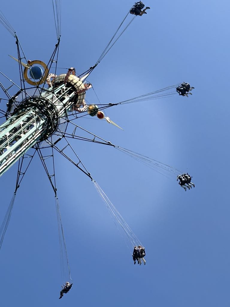 Väl på plats smög vi igång lite fegt med en snäll berg- och dalbana – jag menar, det var typ hundra år sedan jag hängde på en nöjespark, så jag ville inte chocka systemet direkt. Men mitt under åkturen kunde jag inte låta bli att kisa upp mot Himmelskibet, den där 80 meter höga slänggungan som snurrar som en discokula över Köpenhamn. Små säten som dinglar i kedjor, och jag tänkte: ”Wow, snacka om utsikt – kanske kan man se ända till Sverige!” Den såg ju snäll ut, typ som att gunga på en veranda, minus G-krafter och upp-och-ner-kaos. Så den fick det bli. Men herregud, det svajade rejält däruppe, lite som att vara ute på ett stormigt hav under en konstant gir åt babord.