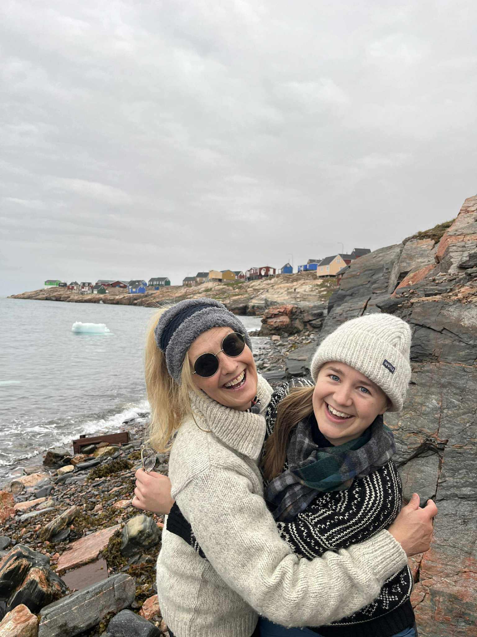 Här sitter jag på östra Grönland med färgglada hus i bakgrunden…