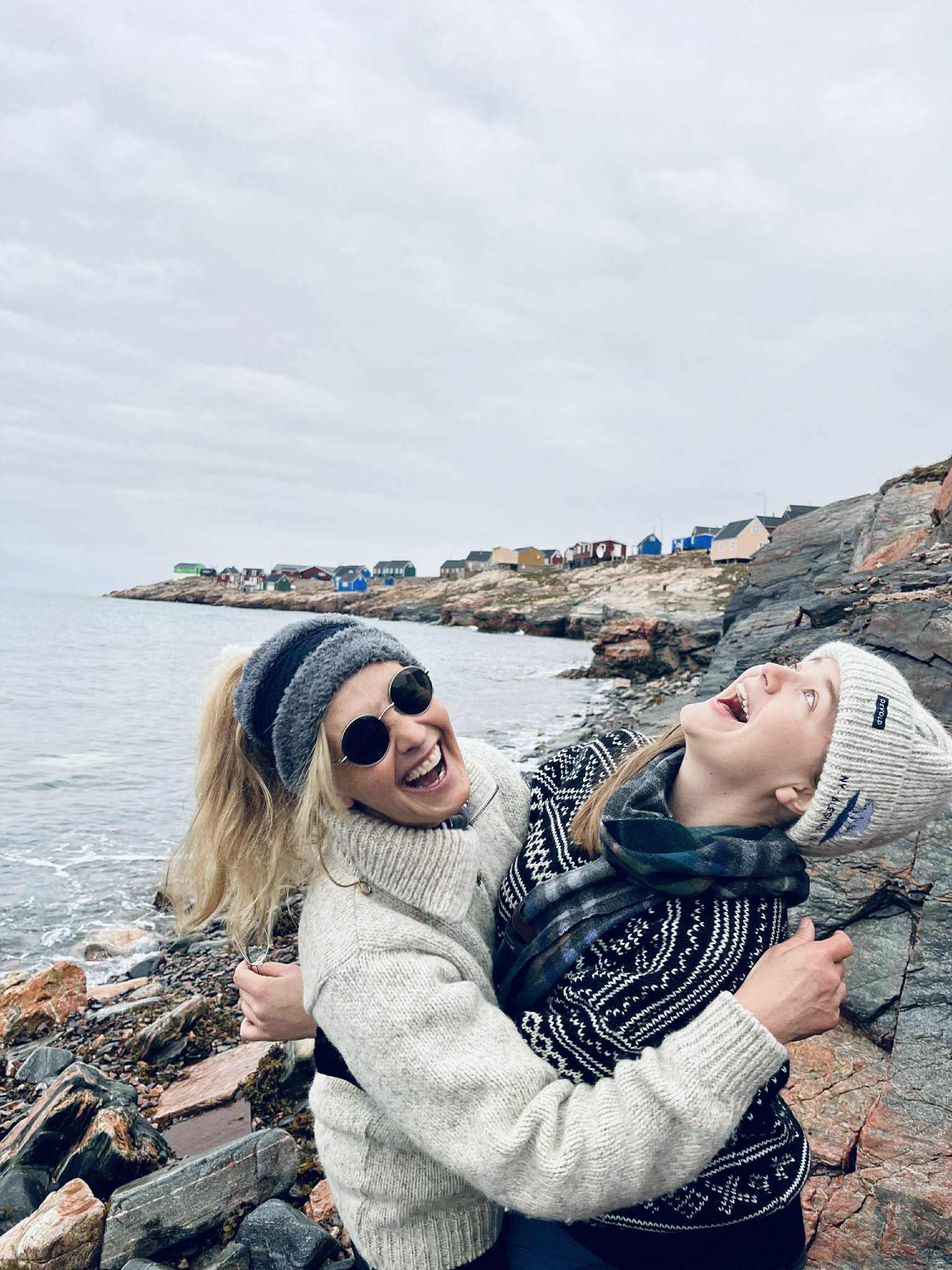 Här poserar jag och Jessika i Grönlands vilda miljö, men en korp som sveper förbi stjäl showen. Naturintresserad som hon är, kan Jessika inte låta bli att följa dess flykt istället för att titta in i linsen.