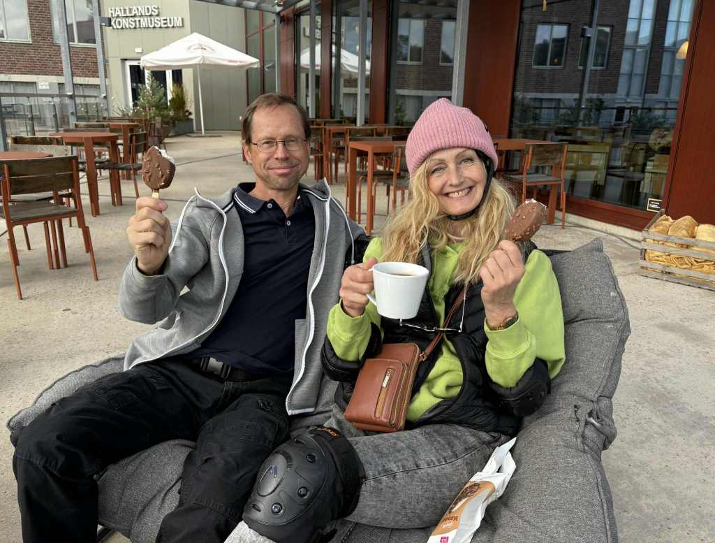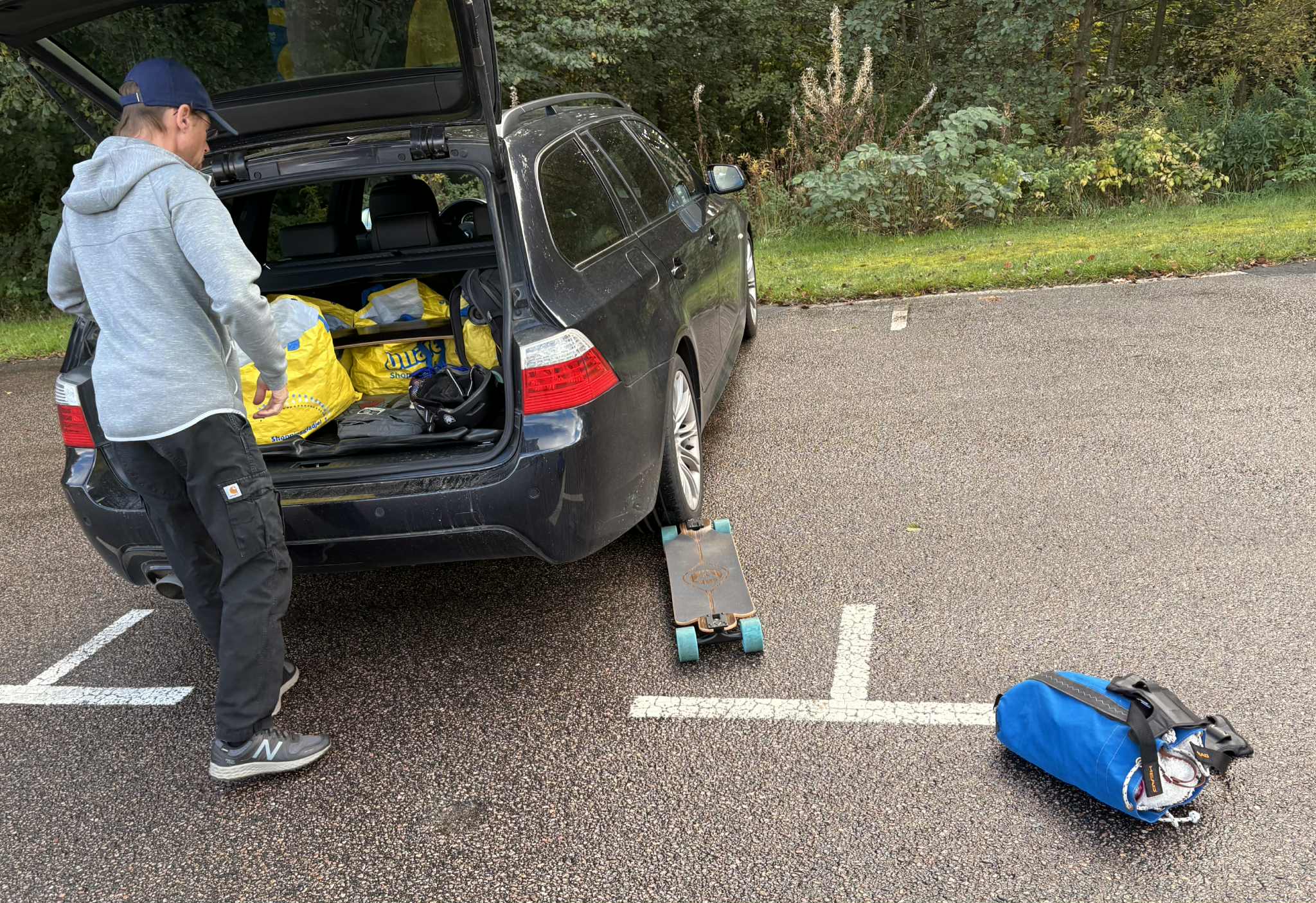 Mr J vistas i perioder i Asien, så jag hade ingen aning om han var i Sverige. Men snart plingade svaret in – han befann sig norr om Halmstad och ville gärna hänga med och åka några timmar på eftermiddagen. När hans bil rullade in framför mitt hus skuttade jag ut med brädan, skydden och en liten ryggsäck.