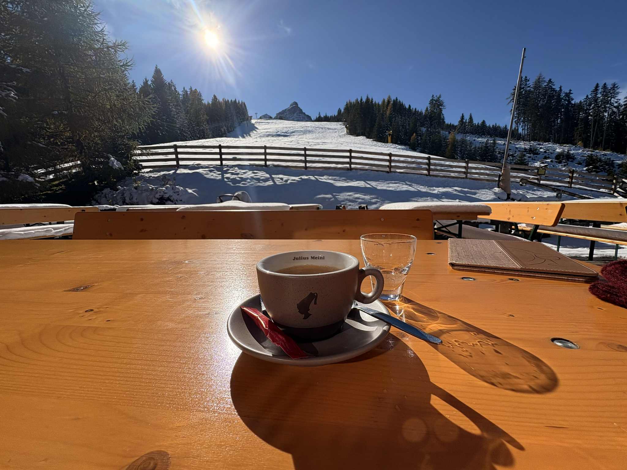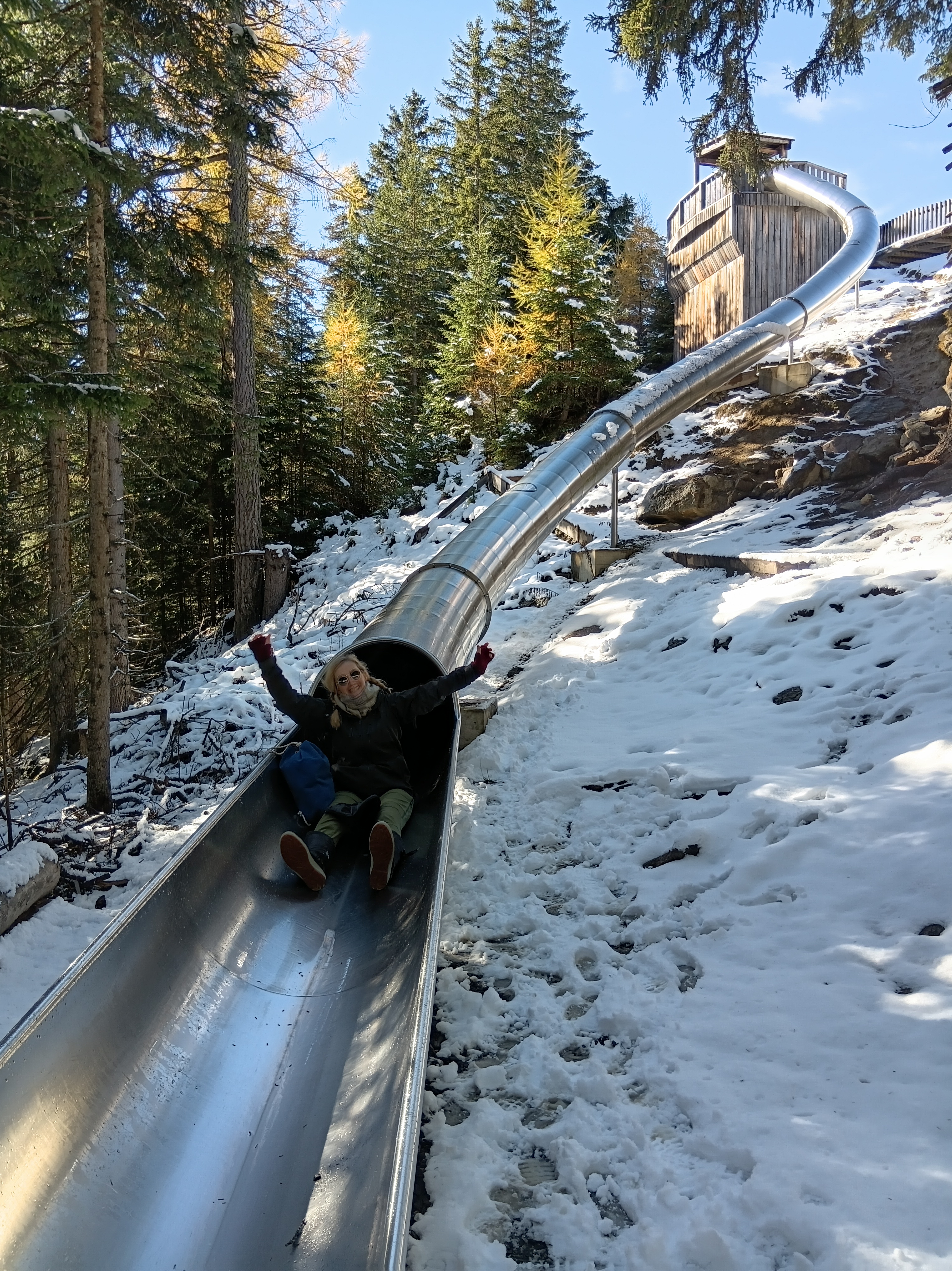 Hur är det ens möjligt att slå gårdagens upplevelser? Men det går tydligen. Andra morgonen vaknade vi till strålande solsken – och nyfallen snö som pudrade Serles, berget som reser sig precis intill. Efter en lång, mysig morgon klädde vi på oss och gav oss iväg mot linbanan…