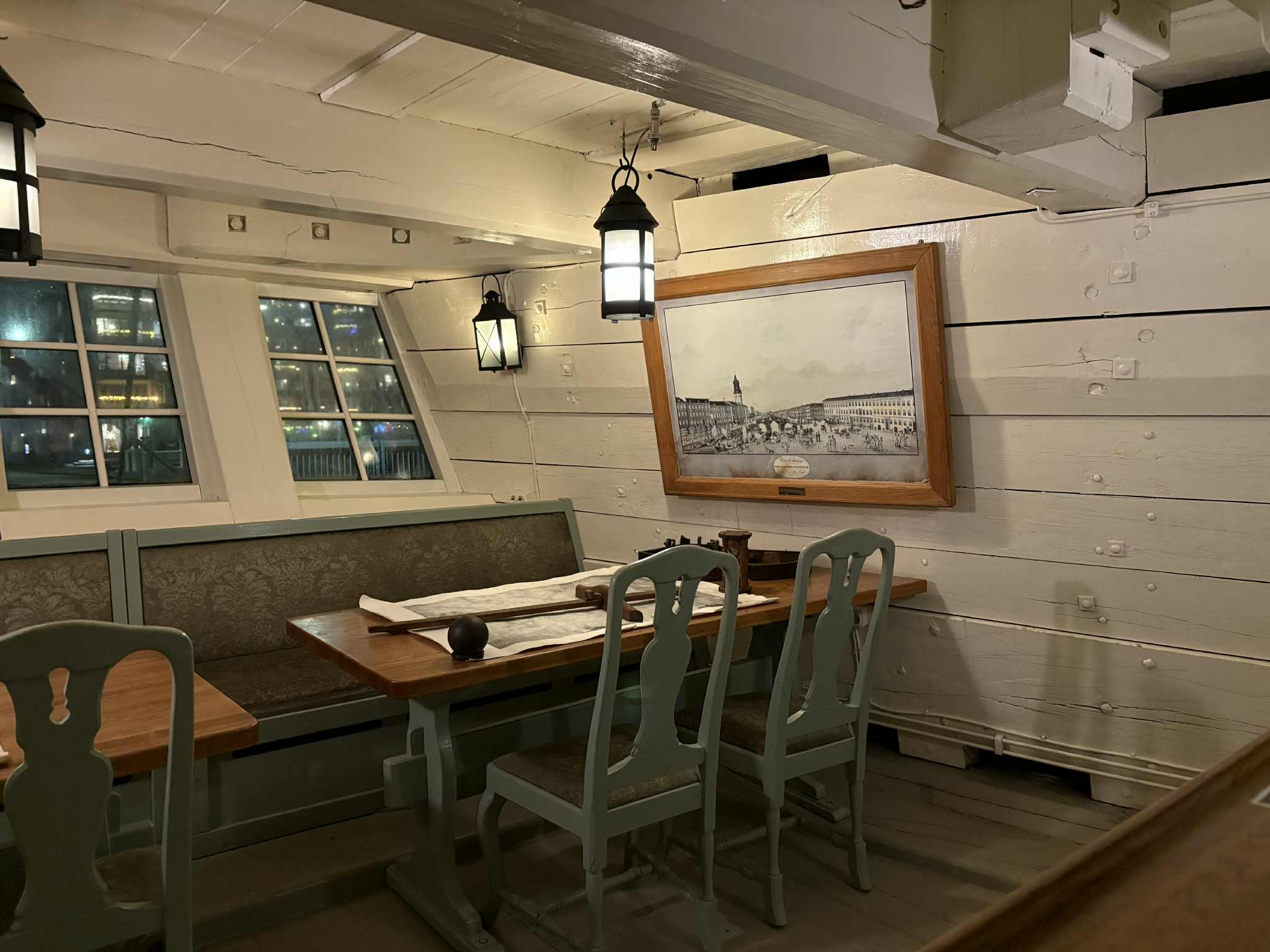 Freyas webmaster som seglat med detta magnifika skepp visade mig och en kollega runt. Detta fartyg som andas sjöfartshistoria från 1700-talet och som är en rekonstruktion av det ursprungliga som seglade till Kina på handelsresor. Det är imponerande att se hur allt är byggt med tidstypiska material och metoder och höra lite om hur livet kunde vara ombord.
