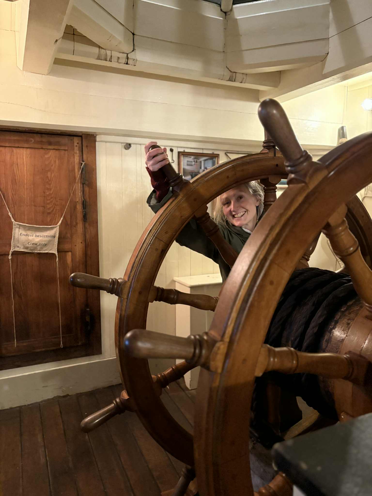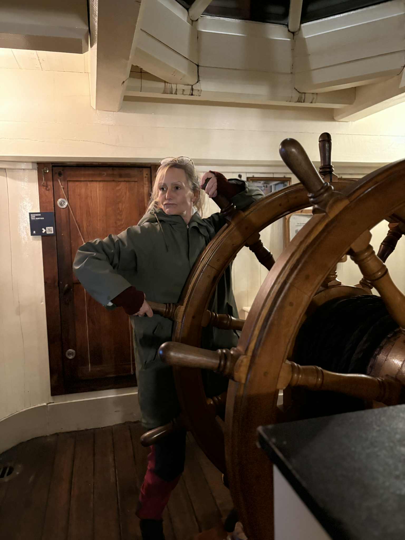 Efter rundturen hamnade vi i byggnaden intill, Pir 4, där caféet och butiken ligger. De hade precis haft en julfest som höll på att rundas av, med glöggdoft och julstämning i luften. Vi blev en blandad grupp från båda skeppen som slog oss ner och pratade – om fartyg, resor och allt däremellan. Sådana spontana möten mellan sjöfolk är bland det bästa med det här livet.