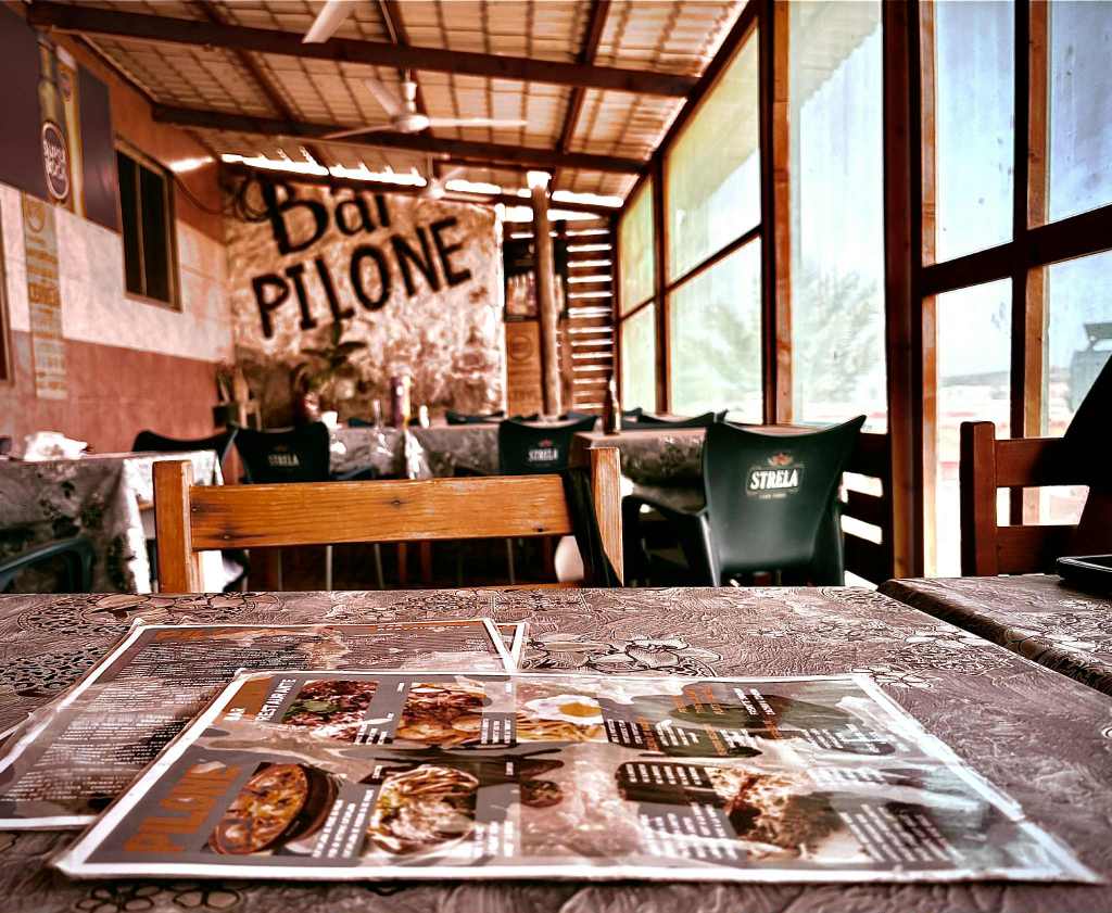 Bakom något fönster hörde vi plötsligt ett barn ropa efter oss. Snart dök restaurangen upp, precis som Konstruktören hade koll på – oväntat mitt i ingenstans, som ett efterlängtat vattenhål för en törstig vandrare i hettan. Vi gled in, och innan vi hann slå oss ner vid ett av borden torkades stolar och bord av noggrant, dubbla gånger, trots att restaurangen hade sandavvisande nätväggar runt om.
