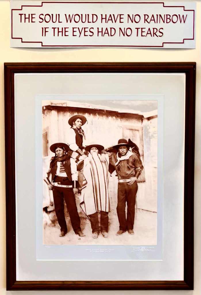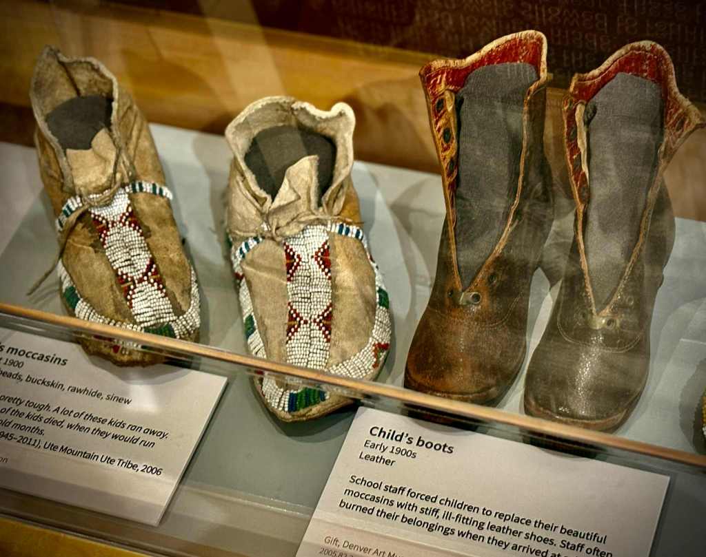 När vi passerade Montrose stannade vi till vid Ute Indian Museum. Det var inte planerat som någon höjdpunkt, men det blev det. Där, i en enkel monter, stod ett par små barnskor: på ena sidan mjuka, vackert pärlbroderade mockasiner som bar spår av händer som älskat och vårdat. Bredvid stod ett par hårda, till synes obekväma läderkängor – de som tvingades på Ute-barnen när de skickades till nybyggarnas skolor. Skolorna som ibland brände upp allt som luktade deras kultur, deras hem, deras identitet. Jag stod där länge. Min egen sköra tid, som jag lagt bakom mig, har gjort mig mer sårbar för andras smärta. När jag ser eller hör om människors lidande känner jag starkt och plötsligt kan tårarna börja bränna bakom ögonlocken. Så blev det nu, när jag tittade på de där skorna. Så många platser i historien – och fortfarande i nutiden – handlar om hur vi behandlar dem som bär en annan kultur, som tänker annorlunda, som bara är olika oss. Det väcker en djup medkänsla i mig; tänk på hur vi gång på gång förtryckt dem som var här först, som inuiterna eller Ute-folket, och fortfarande gör det på olika sätt idag. Det känns så fel att det ska vara så, vi människor kan så mycket bättre.”