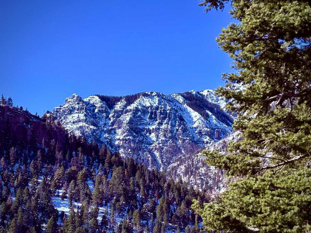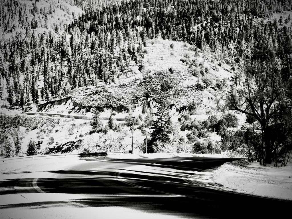 Million Dollar Highway, namnet låter overkligt, som en existerande väg som man inte kan sätta prislappen på för att den är så vacker. Men man förstår varför när man följer kurvorna som sveper fram och de vassa topparna i San Juanbergen får omgivningen att ständigt byta skepnad. Stupande raviner med bergväggar som tycks rasa rakt ner i asfalten, tills en skarp kurva plötsligt bryter bakom krönet och sen – alla dessa vackra snötäckta pass. Men det är ingen väg för den som lider av höjdskräck; ibland körde vi så nära kanten att man kunde snegla rakt ner i avgrunden, där marken försvann i ett svart hål av sten och skugga. Vi körde bara en bit, bara för att låta vyerna sjunka in på riktigt, innan de långa timmarna tillbaka mot Alma tog vid.